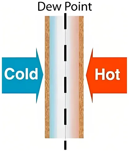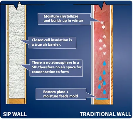 控制濕度對(duì)于防止房屋損壞至關(guān)重要,闊森特?結(jié)構(gòu)保溫板(SIP)為這個(gè)問(wèn)題提供了有效的解決方案。蒸汽自然地從墻壁的溫暖一側(cè)移動(dòng)到寒冷的一側(cè),這一過(guò)程稱為擴(kuò)散。當(dāng)蒸汽穿過(guò)家的墻壁時(shí),它會(huì)達(dá)到露點(diǎn),從而導(dǎo)致冷凝。傳統(tǒng)的帶有空腔的墻壁為濕氣積聚提供了表面,從而導(dǎo)致腐爛和發(fā)霉。