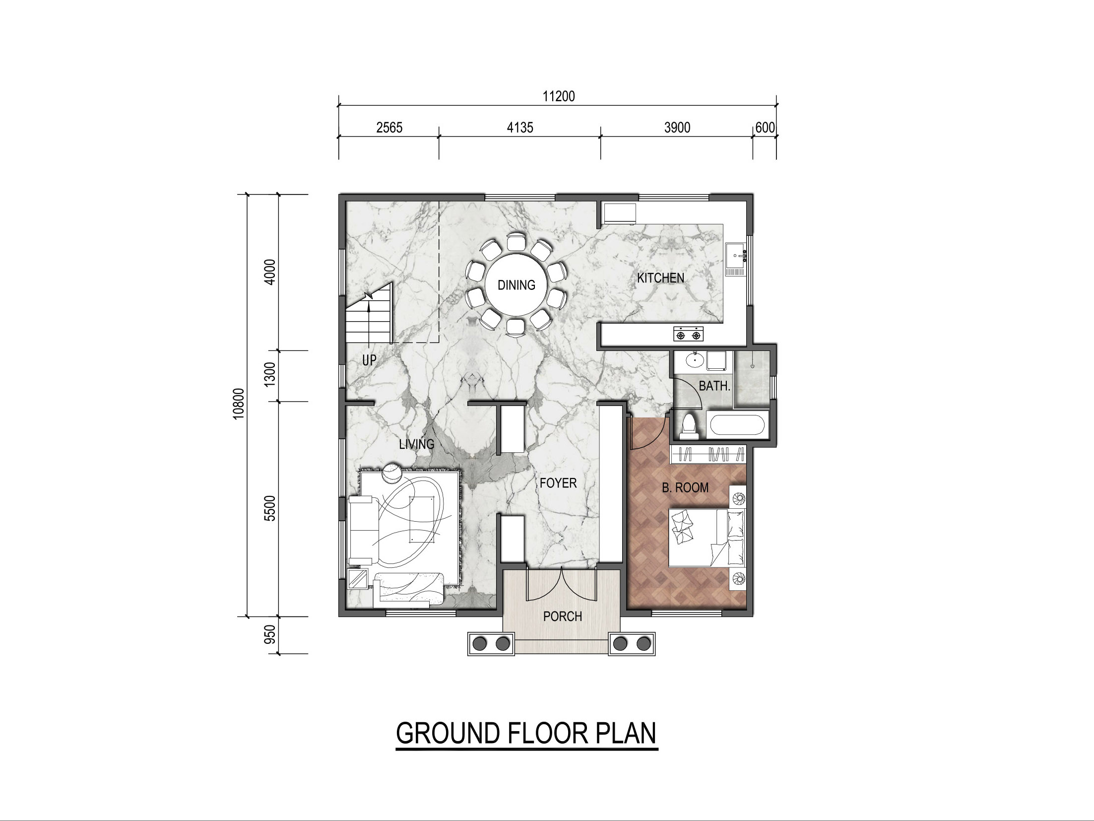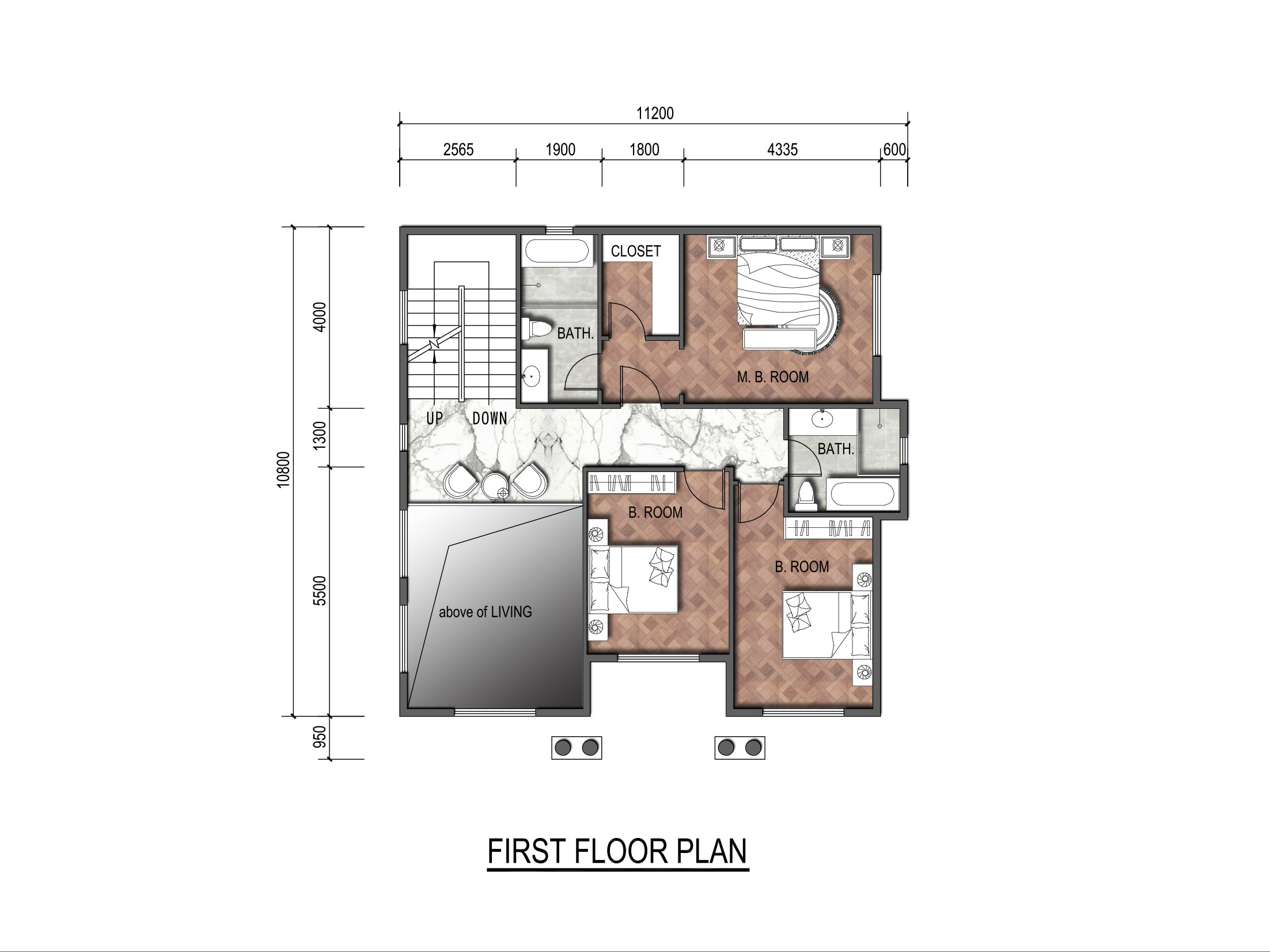 PLAN 6303 的基本信息 尺寸 寬 11.2m 深度 10.8m 面積(㎡) 一樓 112㎡ 占地面積 119㎡ 總建筑面積 287㎡ 高度(m) 1樓 3.0m 總高度 11.0m 每戶樓層 X3 臥室 X4 客廳 X2 浴室 X4 露臺(tái) X2 車庫(kù) X0 閣樓 X0