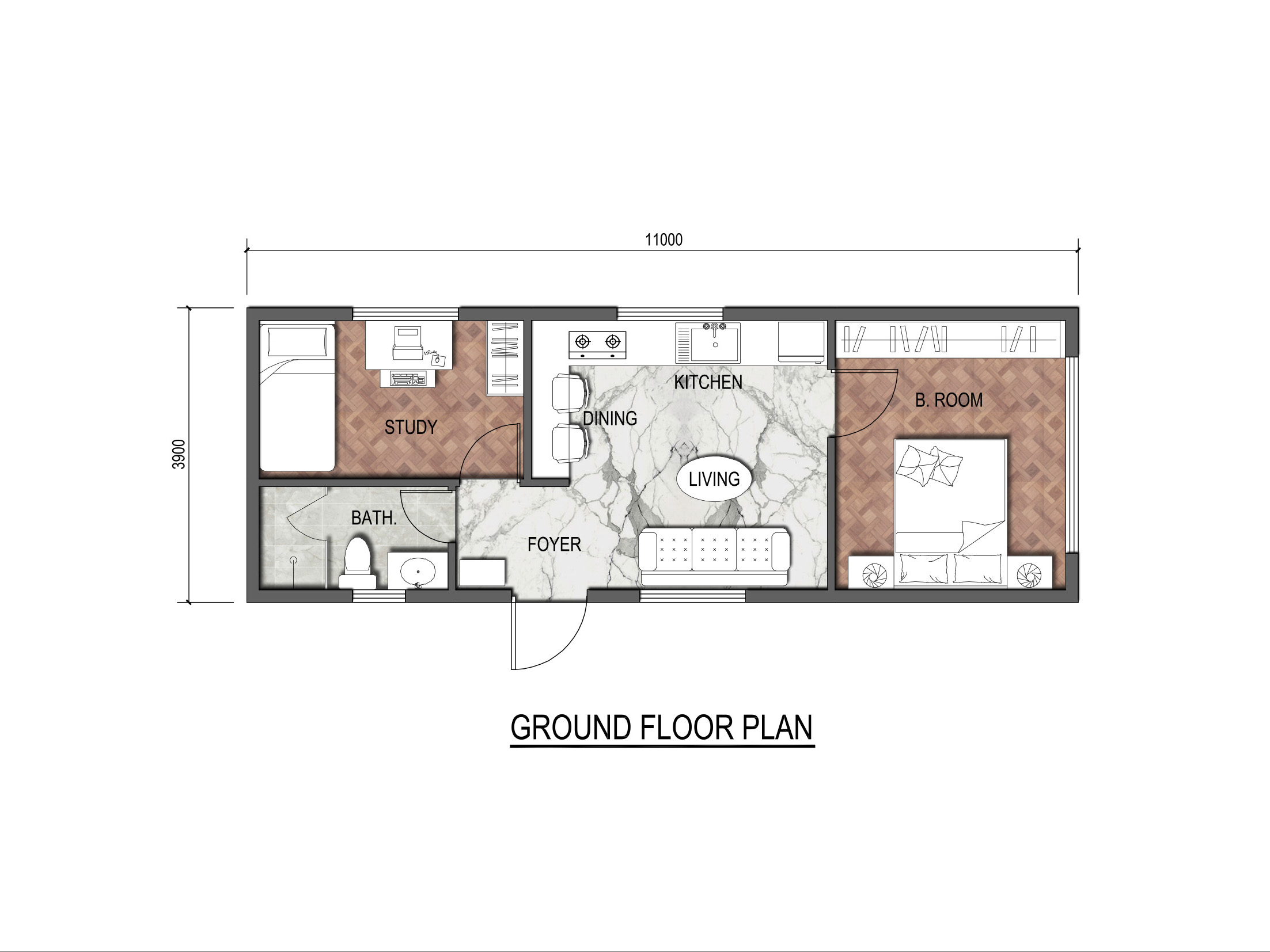 PLAN 6325 的基本信息 尺寸 寬 11.0m 深度 3.9m 面積(㎡) 一樓 43㎡ 占地面積 43㎡ 總建筑面積 43㎡ 高度(m) 1樓 3.0m 總高度 3.0m 每戶 樓層 X1 臥室 X2 客廳 X1 浴室 X1 露臺(tái) X0 車庫(kù) X0 閣樓 X0
