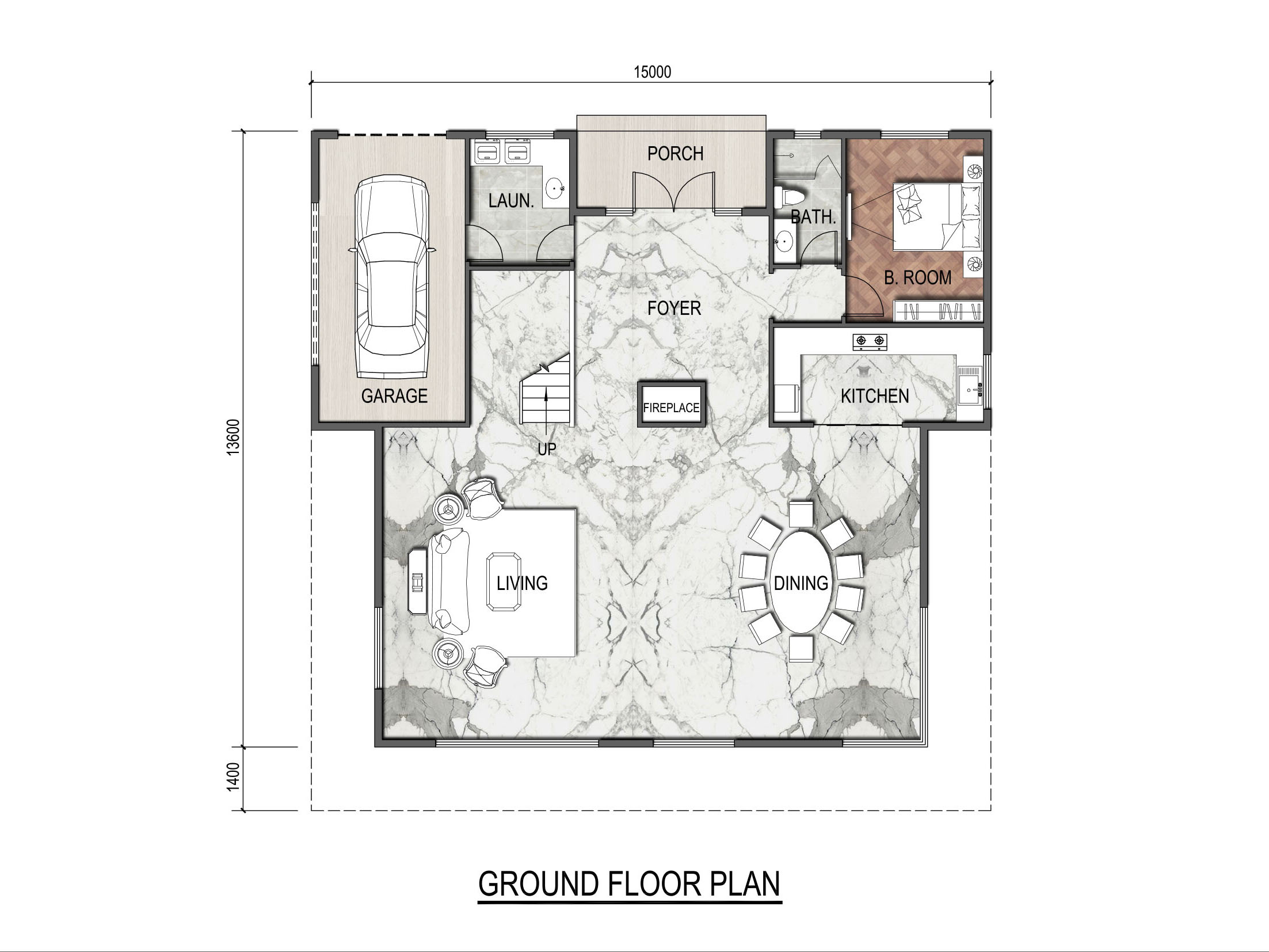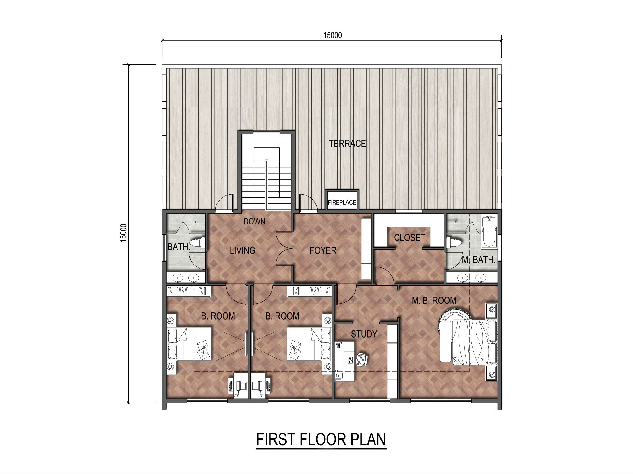 PLAN 6406 基本信息 尺寸 寬 15.0m 深度 15.0m 面積(㎡) 1樓 181㎡ 占地面積 181㎡ 總建筑面積 318㎡ 高度(m) 1樓 3.0m 總高度 6.25m 每戶 樓層 X2 臥室 X4 客廳 X2 浴室 X3 露臺 X1 車庫 X1 閣樓 X0