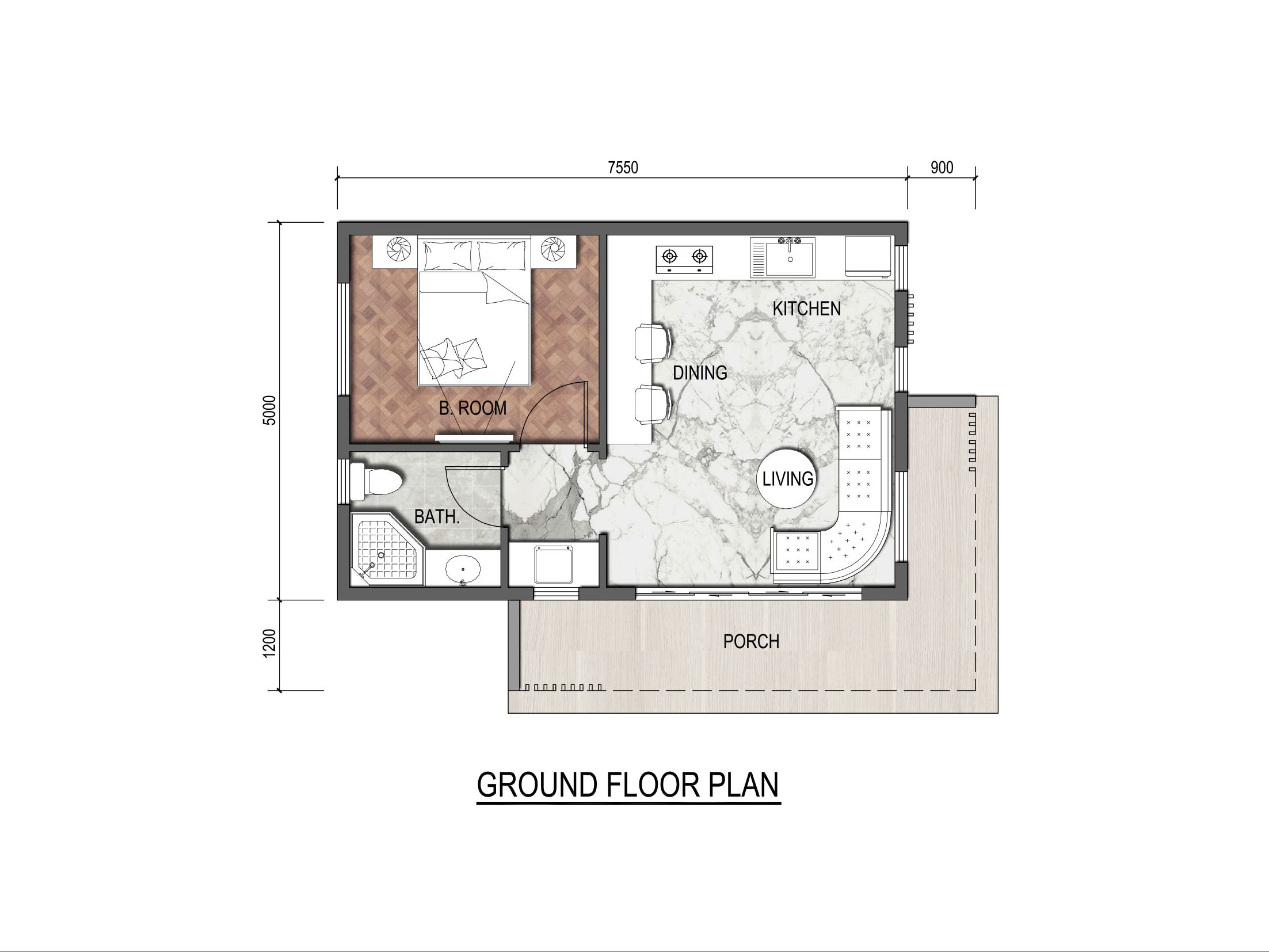 PLAN 6407 的基本信息 尺寸 寬 7.55m 深度 5.0m 面積(㎡) 一樓 38㎡ 占地面積 38㎡ 總建筑面積 38㎡ 高度(m) 1樓 3.8m 總高 3.8m 每戶(hù) 樓層 X1 臥室 X1 客廳 X1 浴室 X1 露臺(tái) X1 車(chē)庫(kù) X0 閣樓 X0