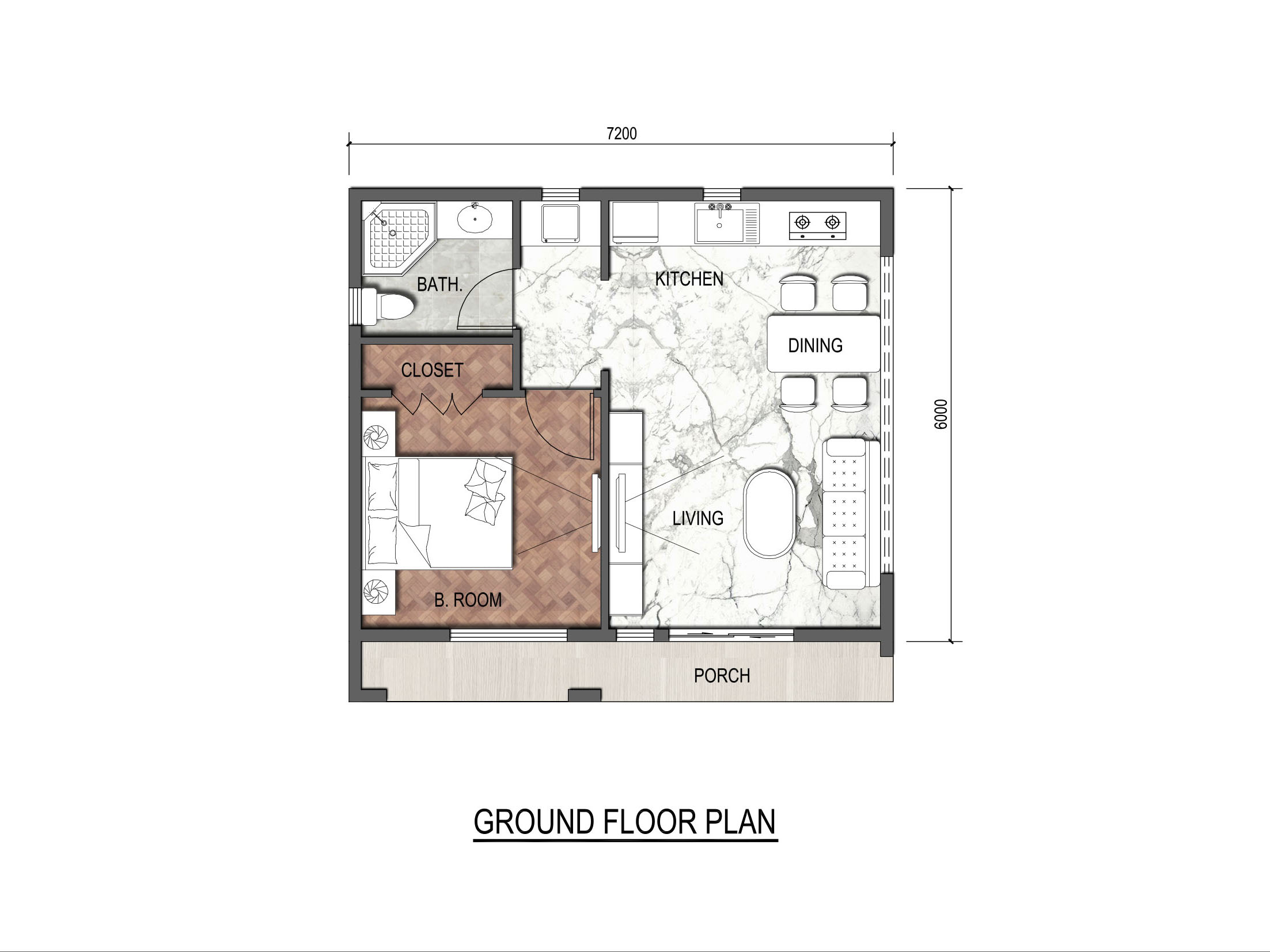 PLAN 6408 基本信息 尺寸 寬 7.2m 深度 6.0m 面積(㎡) 一樓 43㎡ 占地面積 43㎡ 總建筑面積 43㎡ 高度(m) 1 樓 4.0m 總高度 4.0m 每戶 樓層 X1 臥室 X1 客廳 X1 浴室 X1 露臺(tái) X1 車庫(kù) X0 閣樓 X0