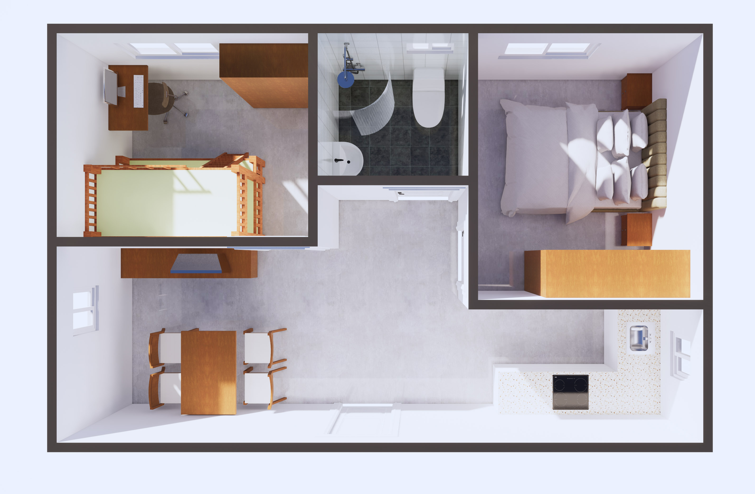 1 層、 2 臥室、 1 廳、 1 衛(wèi)生間、 露臺(tái)、 車庫(kù)、
