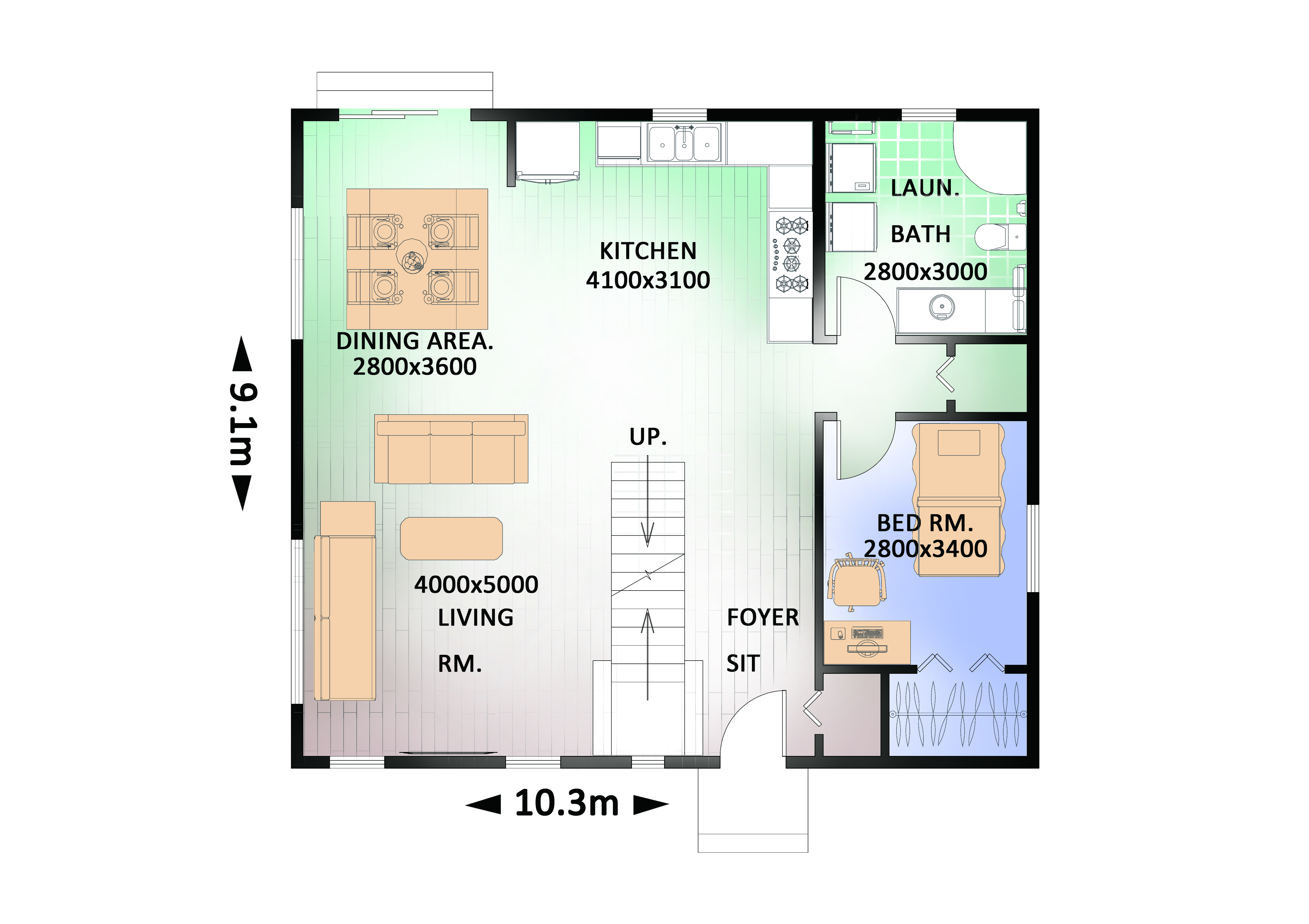 開(kāi)間 10.4 m、 進(jìn)深 9.1 m、