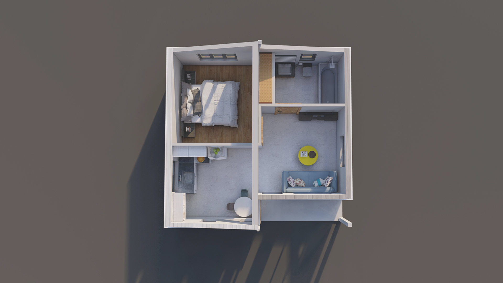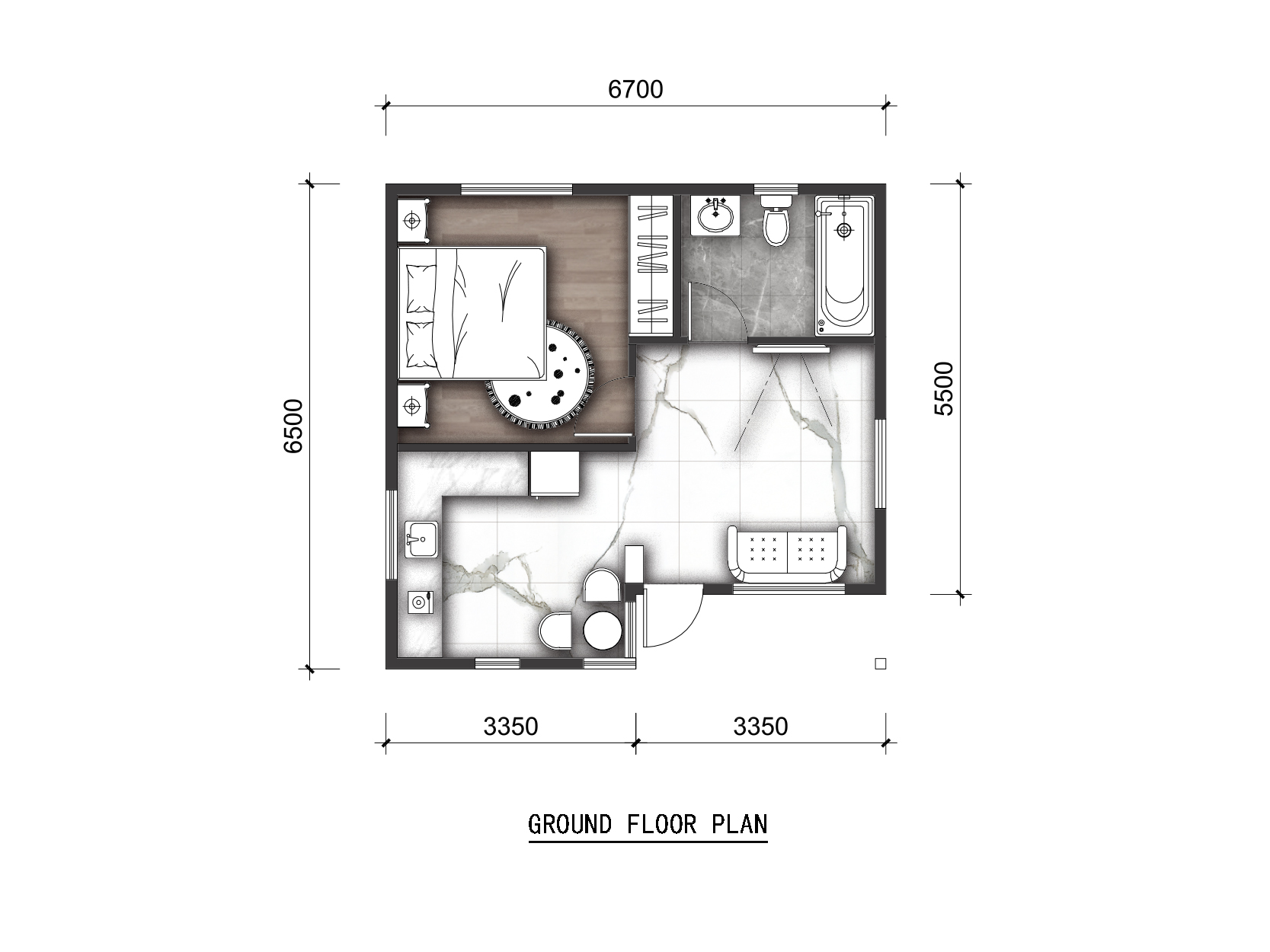 PLAN 6631 的基本信息 尺寸 寬 6.7m 深度 6.5m 面積(㎡) 1樓 40.2㎡ 占地面積 43.56㎡ 總建筑面積 43.56㎡ 高度(米) 一樓 3.18m 總高度 3.66m 每戶 樓層 X1 臥室 X1 客廳 X1 浴室 X1 露臺(tái) X1 車庫(kù) X0 閣樓 X0