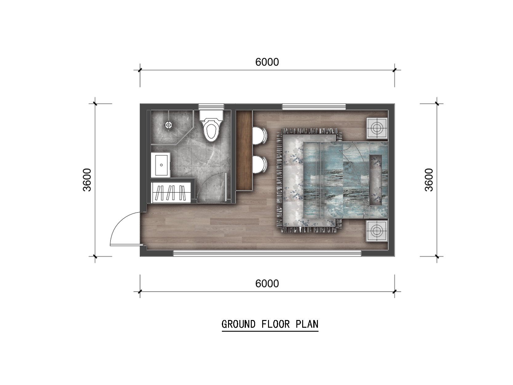 PLAN 6434 的基本信息 尺寸 寬 6m 深度 3.6m 面積(㎡) 一樓 21.6㎡ 占地面積 21.6㎡ 總建筑面積 21.6㎡ 高度(m) 1樓 2.8m 總高度 3.3m 每戶(hù) 樓層 X1 臥室 X1 客廳 X1 浴室 X1 露臺(tái) X0 車(chē)庫(kù) X0 閣樓 X0
