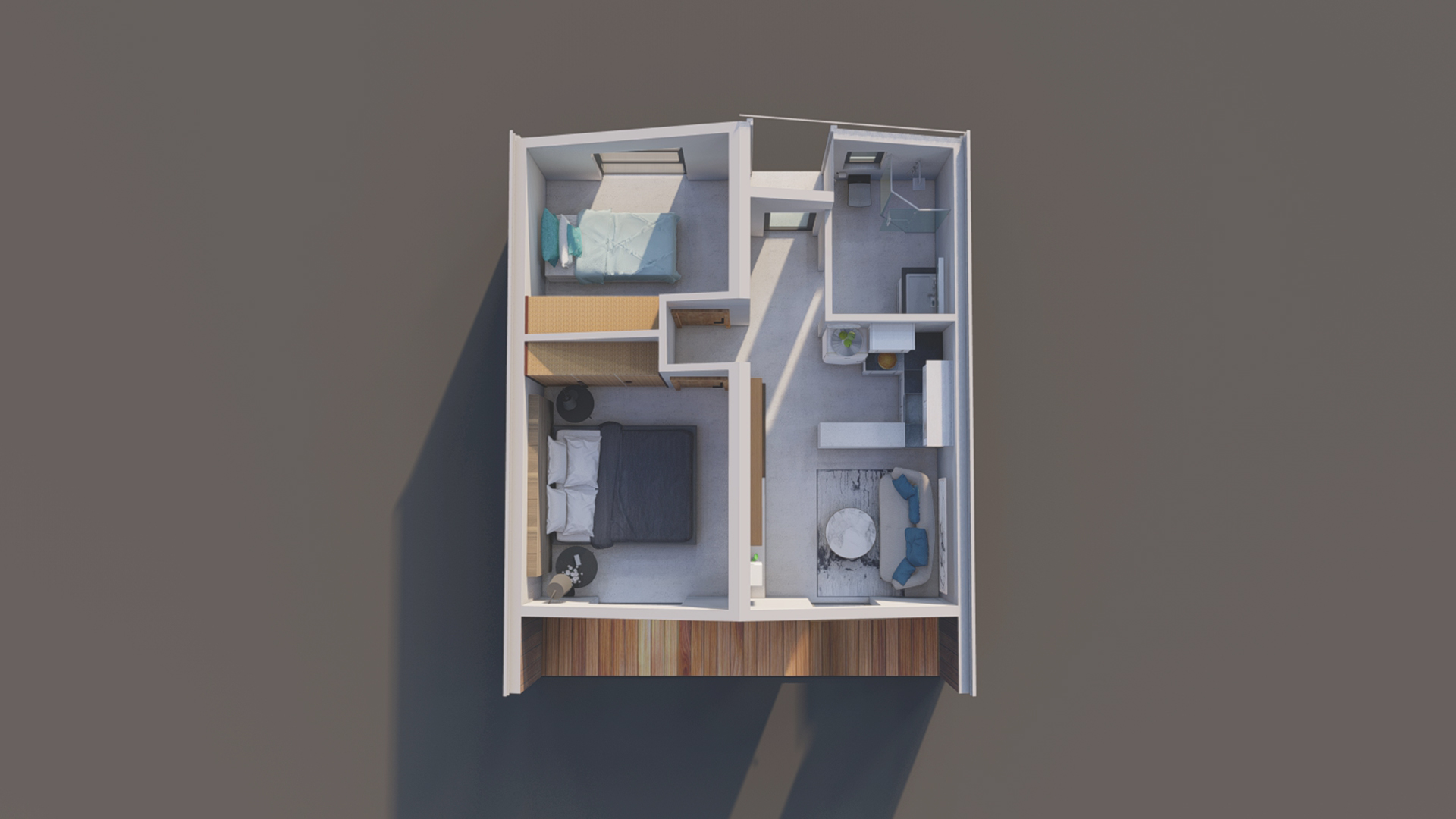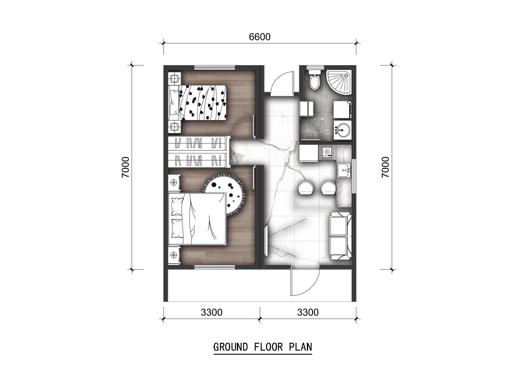 PLAN 6635 的基本信息 尺寸 寬 6.6m 深度 7m 面積(㎡) 1樓 46.94㎡ 占地面積 46.94㎡ 總建筑面積 46.94㎡ 高度(米) 一樓 3.20m 總高度 3.62m 每戶 樓層 X1 臥室 X2 客廳 X1 浴室 X1 露臺 X0 車庫 X0 閣樓 X0