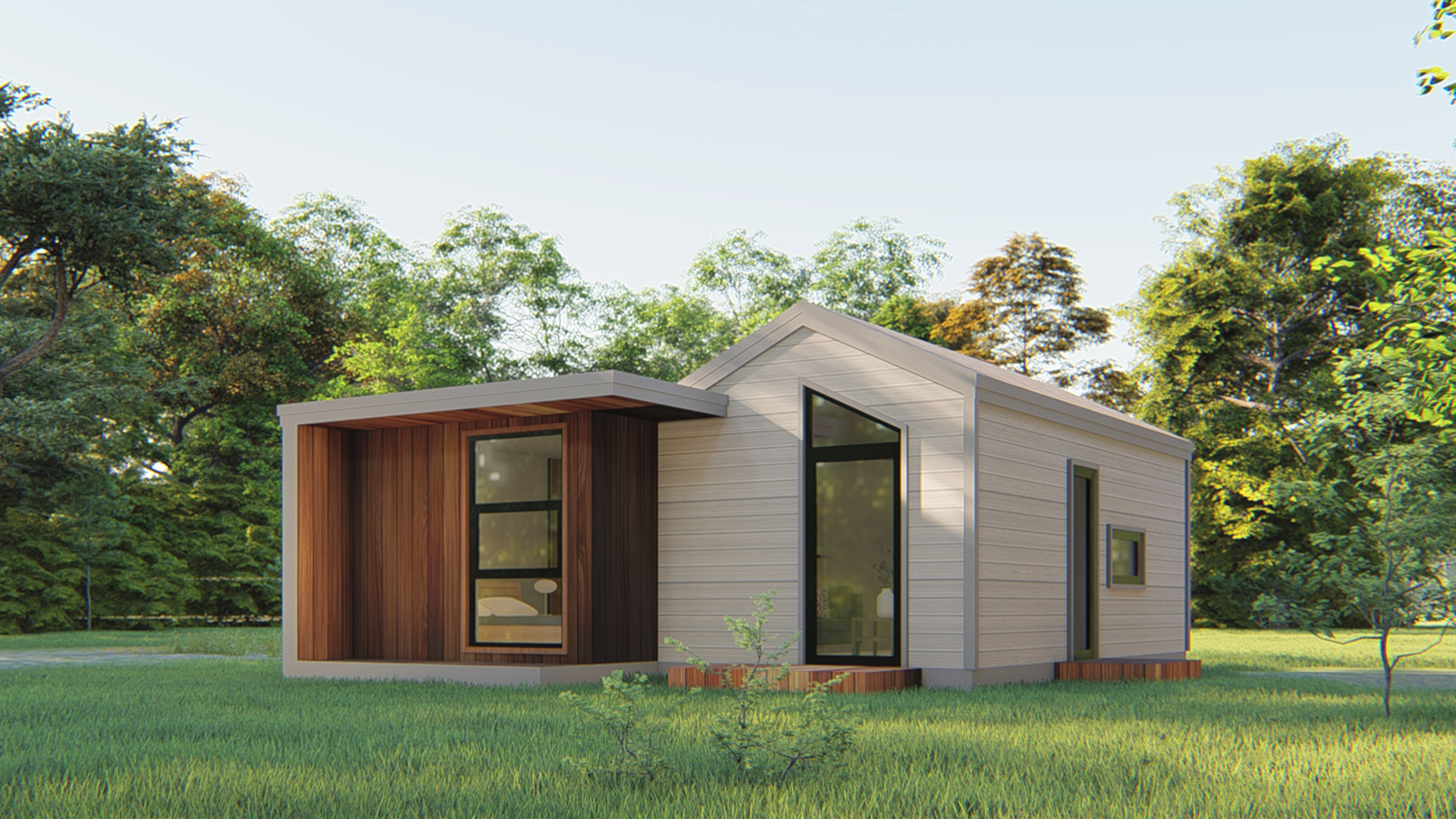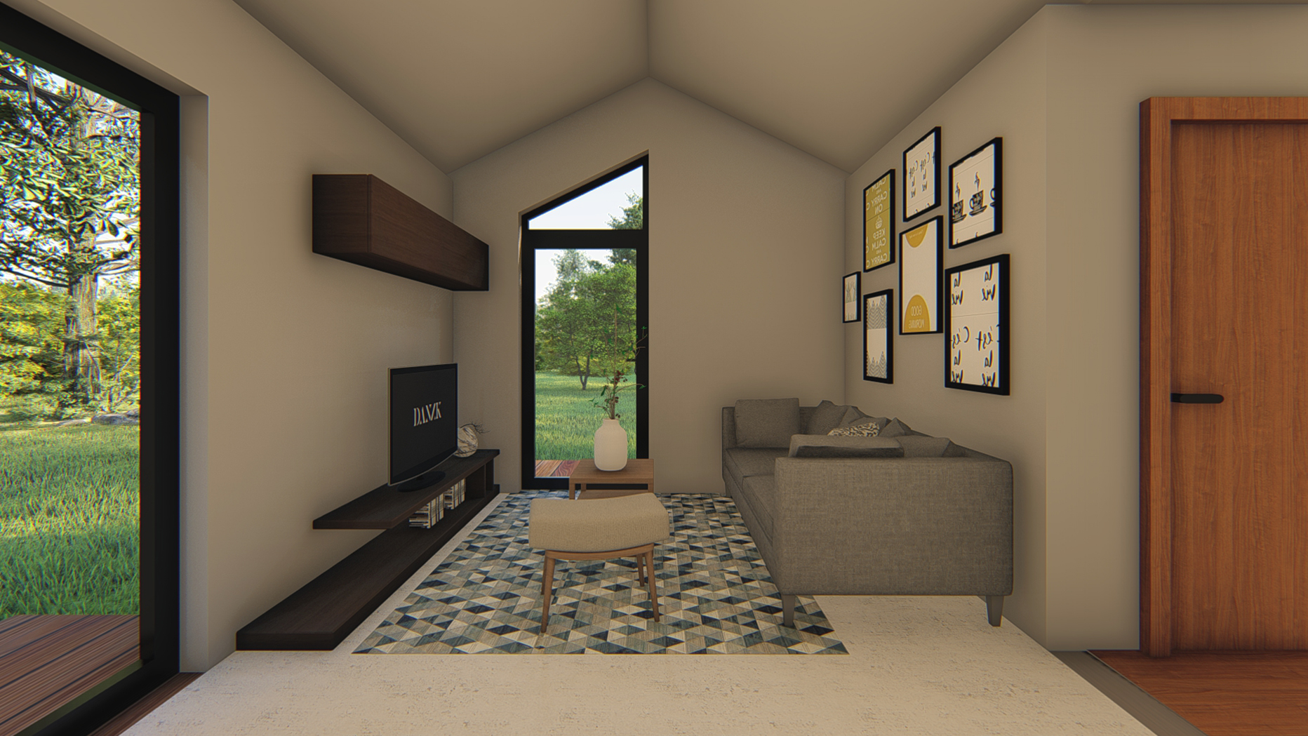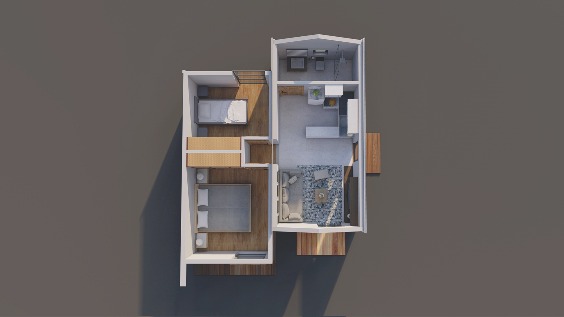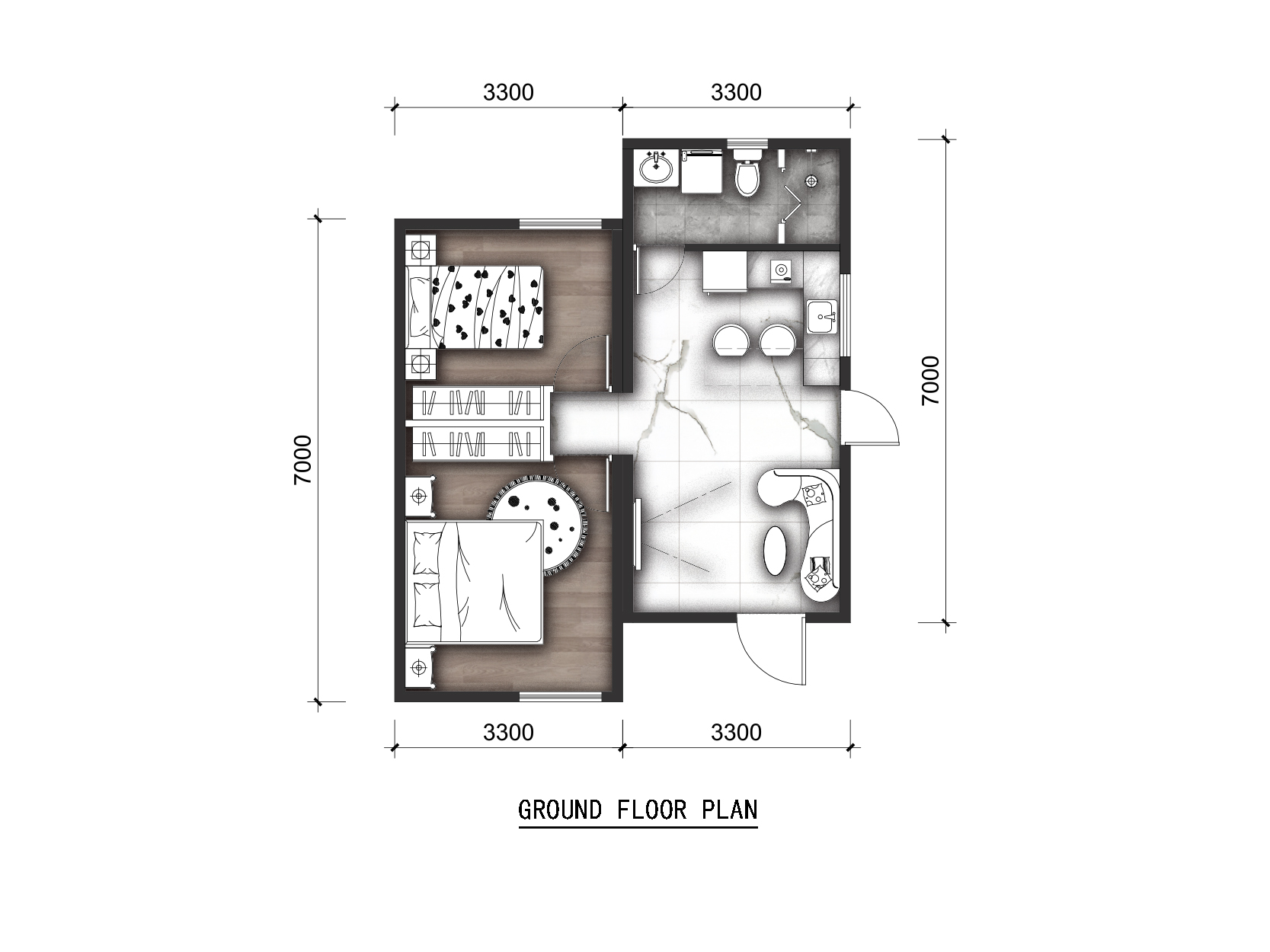PLAN 6636 的基本信息 尺寸 寬 6.6m 深度 8.16m 面積(㎡) 1樓 46.94㎡ 占地面積 46.94㎡ 總建筑面積 46.97㎡ 高度(米) 一樓 3.20m 總高 3.64m 每戶 樓層 X1 臥室 X2 客廳 X1 浴室 X1 露臺(tái) X0 車(chē)庫(kù) X0 閣樓 X0