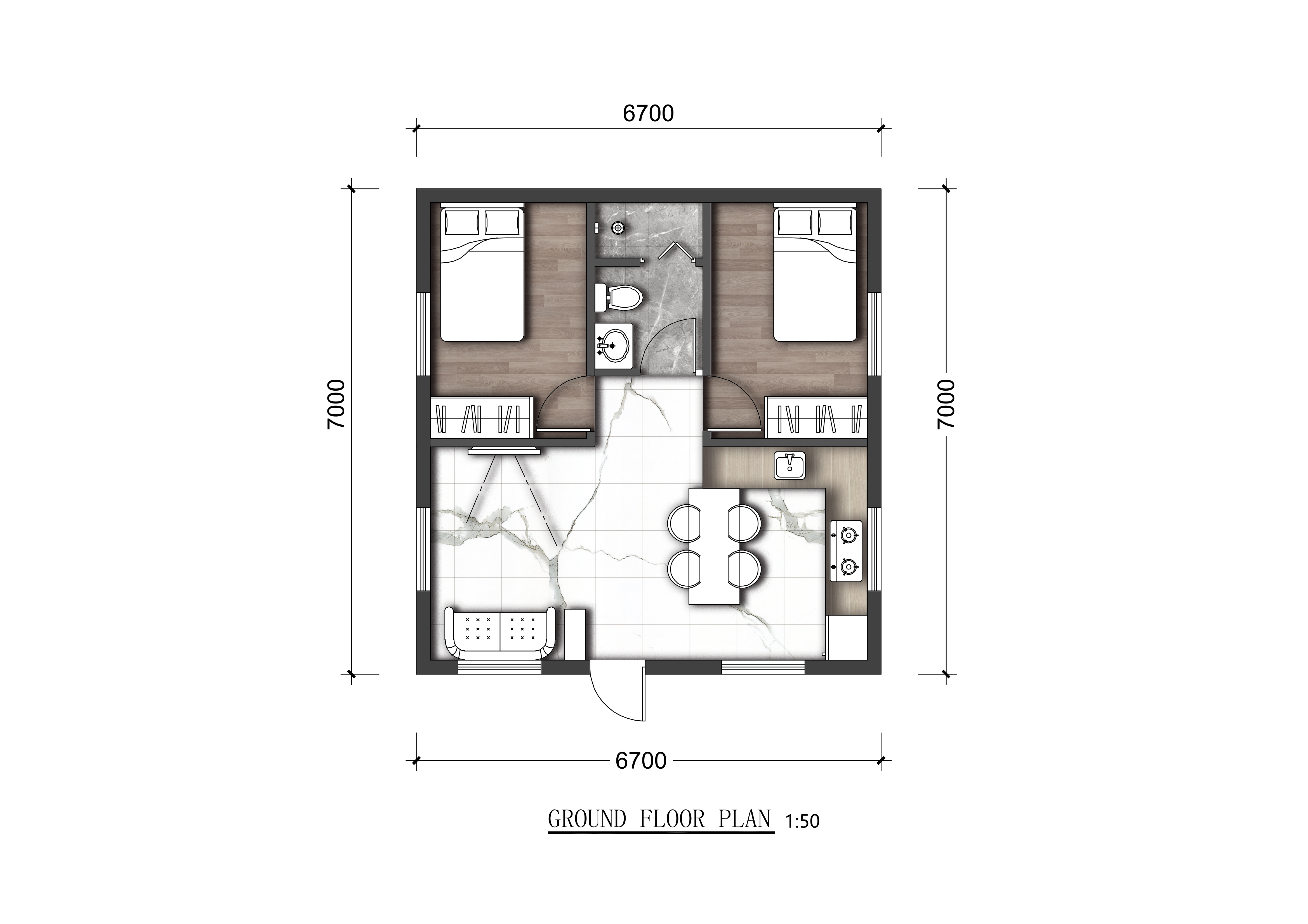 PLAN 6637 的基本信息 尺寸 寬 6.7m 深度 7m 面積(㎡) 1樓 46.9㎡ 建筑面積 46.9㎡ 總建筑面積 46.9㎡ 高度(米) 一樓 2.81m 總高度 4.37m 每戶 樓層 X1 臥室 X2 客廳 X1 浴室 X1 露臺 X0 車庫 X0 閣樓 X0