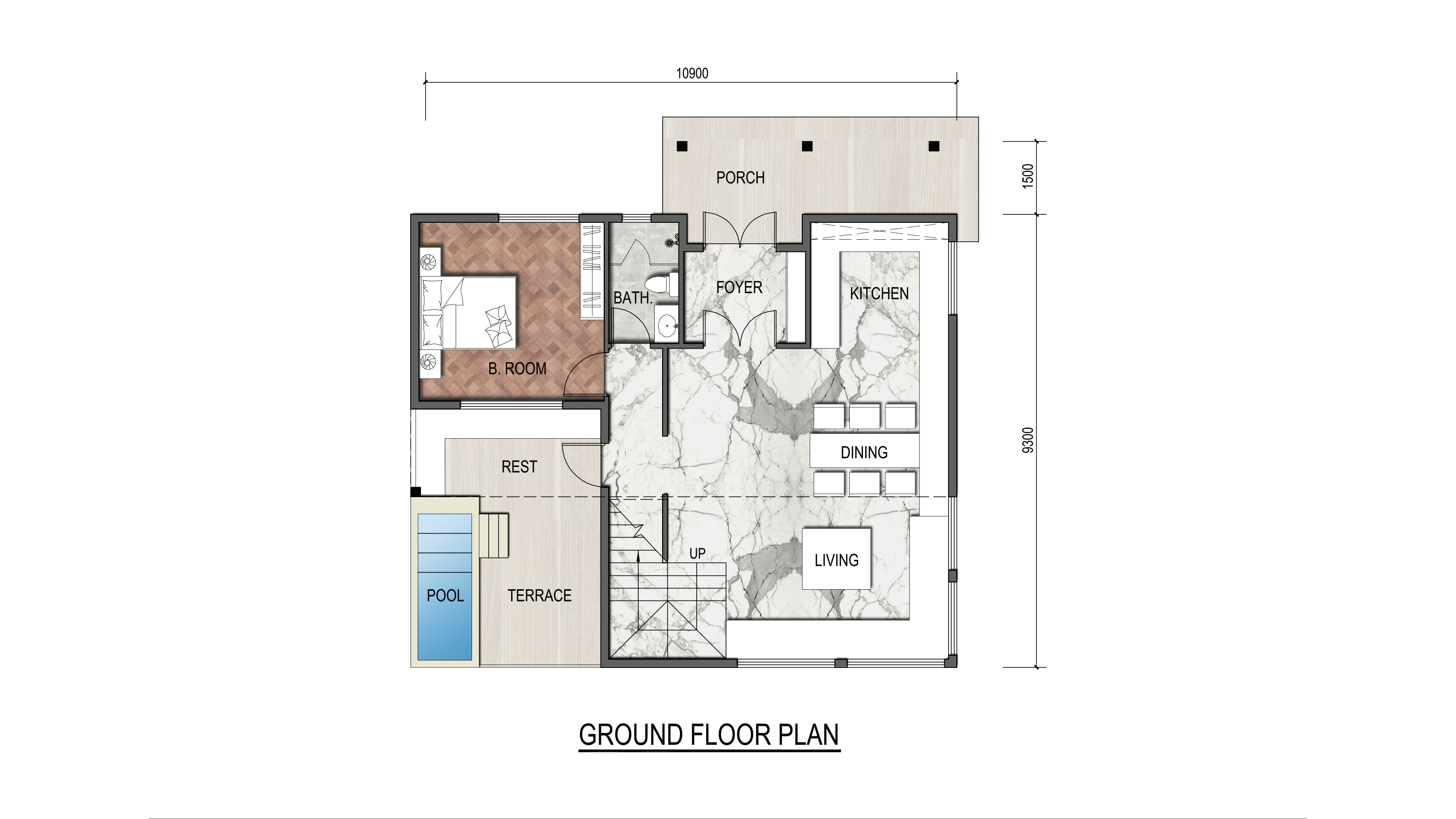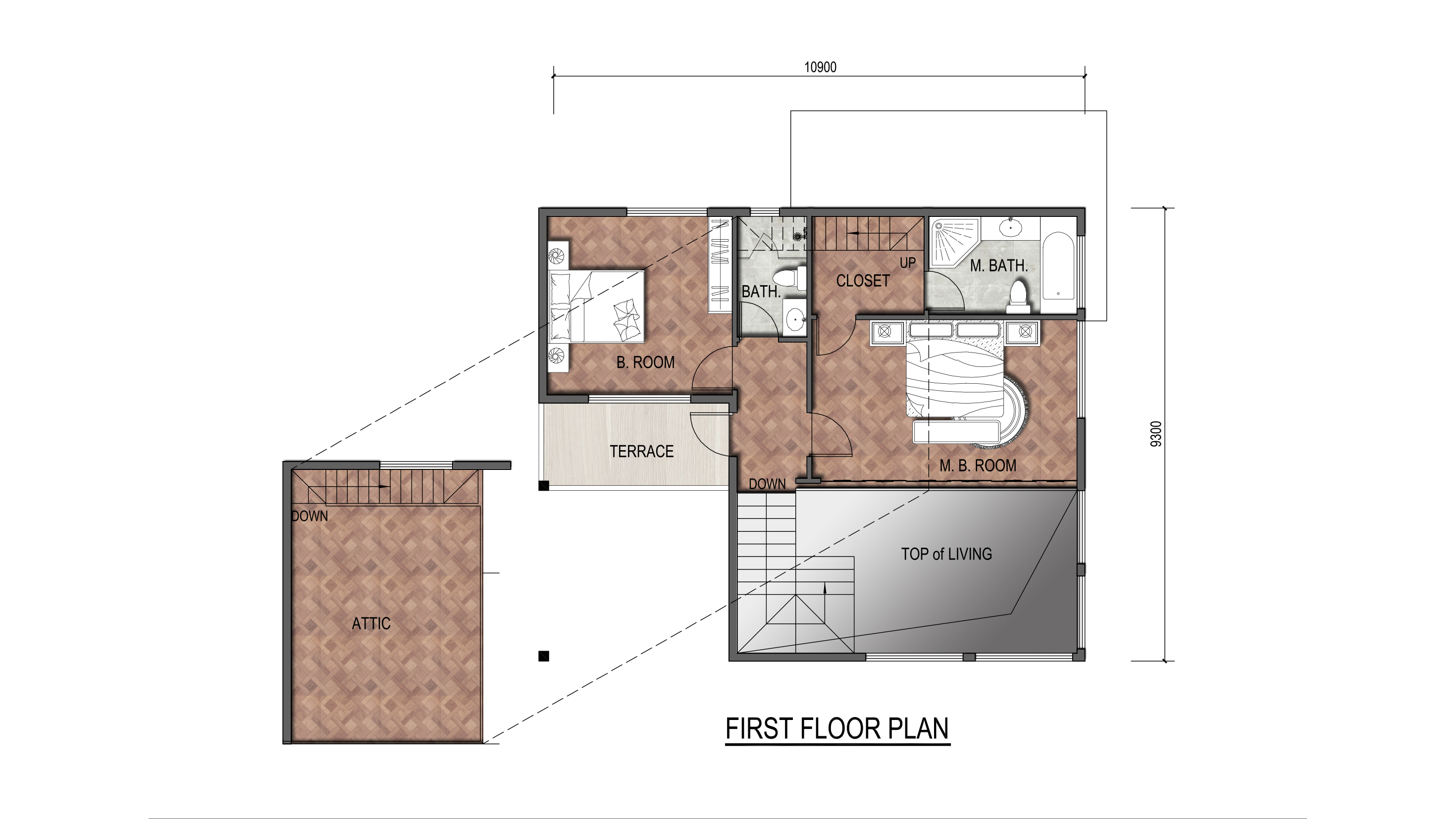 PLAN 6447 的基本信息 尺寸 寬 10.9m 深度 9.3m 面積(㎡) 1樓 83㎡ 占地面積 83㎡ 總建筑面積 165㎡ 高度(m) 1樓 3.0m 總高度 10.0m 每戶(hù) 樓層 X2 臥室 X3 客廳 X1 浴室 X3 露臺(tái) X2 車(chē)庫(kù) X0 閣樓 X1